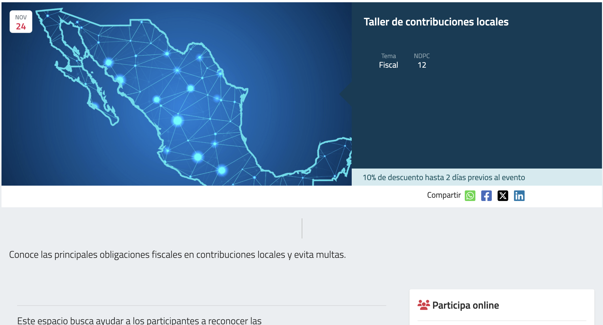 El taller representa una excelente oportunidad para fortalecer tus conocimientos en el ámbito de las contribuciones locales en la CDMX, un campo que muchas veces no se revisa con el mismo detalle que las obligaciones federales, pero que puede implicar sanciones relevantes si no se cumple correctamente. Si tu actividad está impactada por alguno de los temas del temario, este curso puede marcar la diferencia en tu gestión fiscal.